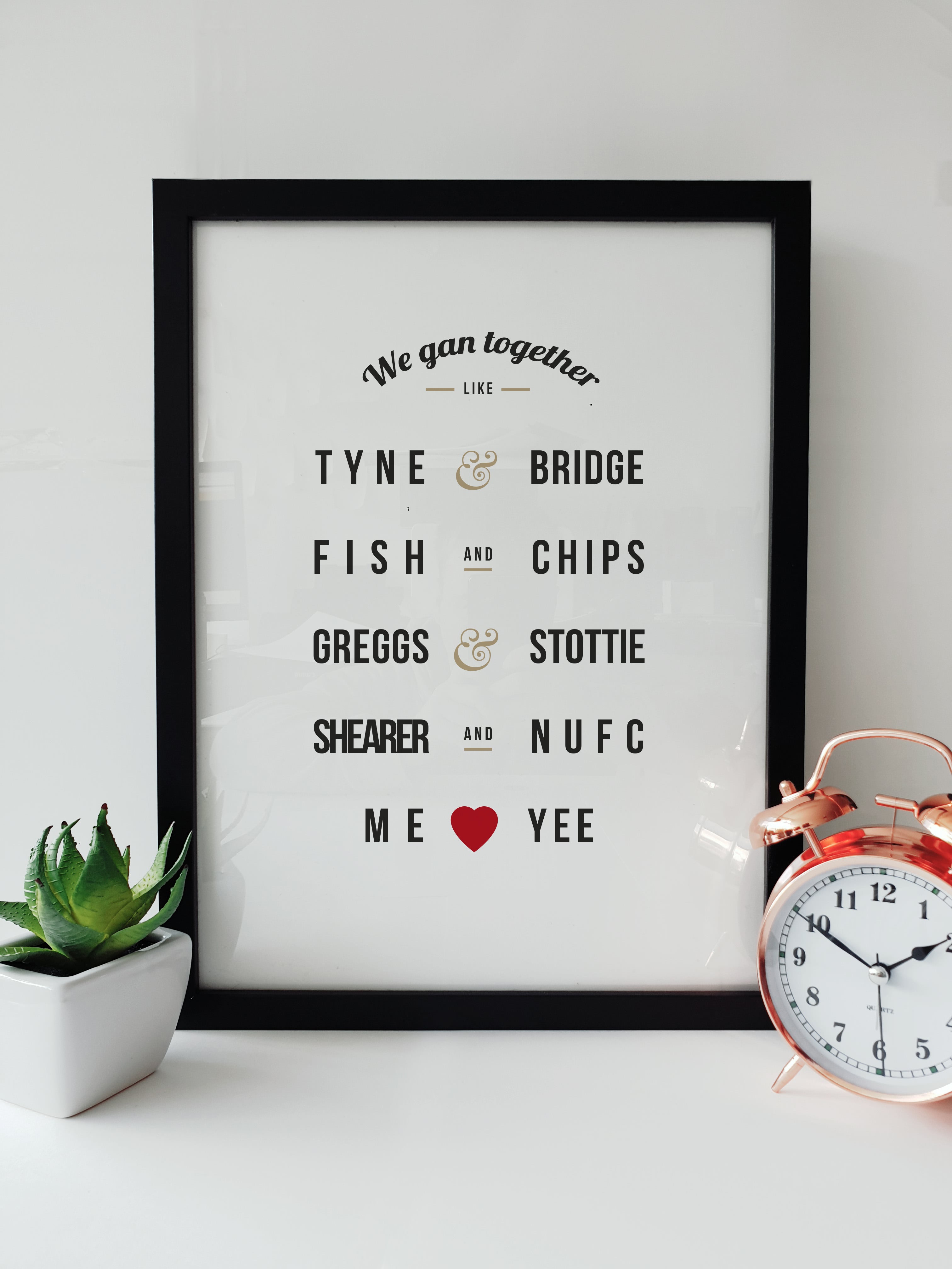 Whether it’s the iconic view of the Quayside or a lunch break at Greggs, there are certain pairings that define life in the Toon. This print celebrates the perfect match, just like you and your partner.
